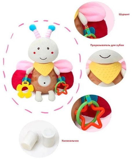 | Информация | Игрушка подвеска с аксессуарами «Бабочка» — маленький и верный друг для вашего малыша! Погремушка-подвеска, выполненная из гипоаллергенных и безопасных материалов, составит компанию вашему малышу и днем, и ночью. Игрушка для младенцев идеально подойдет для того, чтобы брать с собой на прогулку, ее удобно вешать на коляску, детское кресло, манеж или развивающий столик, т.к. у нее надежное крепление, которое позволит игрушке всегда оставаться на виду у ребенка. Детскую подвеску так же можно закрепить на кроватке, и любимый герой будет охранять сон вашего малыша. Игрушка погремушка с колокольчиком развлечет и поможет развить мелкую моторику ребенка. Игрушка станет верным другом с самого рождения! Игрушка подвеска с колокольчиком прекрасно подойдет для подарка на День рождения, крестины, выписку из роддома, Новый год и Рождество. Контрастная мягкая игрушка подвеска для кроватки — это замечательный подарок для малыша. Игрушки погремушки оказывают позитивное влияние на физическое, умственное, эмоциональное развитие малышей, способствуют развитию речи, зрительного и слухового восприятия. Малыш, лежа в кроватке, разглядывает игрушку, концентрирует на ней внимание и проявляет интерес, начинает тянуться за погремушкой и совершает первые движения, учится фокусировать внимание на ярких цветах и начинает различать их. Подвески своими контрастными цветами привлекут и надолго удержат внимание малыша. Не очень громкий звук погремушки не навредит слуховому аппарату малыша, а необычная форма погремушки поможет развить ребенку воображение. Игрушки изготовлены из безопасных и гипоаллергенных материалов, прочных и износостойких. Функционал: шуршащие крылья, колокольчик, погремушки, грызунки. |