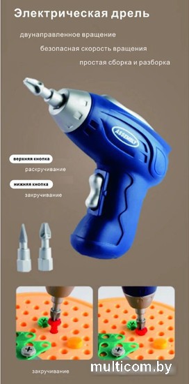 | Информация | ? Детский ящик с ремонтными инструментами подходит как мальчикам, так и девочкам, развивает навыки логического мышления и учит делать задания по образцу. Он также отлично развлекает детей и помогает мамам. Фигуры можно строить как горизонтально, так и вертикально, делая их реалистичными. ? В комплекте: электрический шуруповерт с 2-мя насадками, отвертки, шурупы, болтик и гайки разных цветов, геометрические фигуры, инструкция с примерами, пластиковый чемоданчик. ?? Батарейки не входят в комплект. |