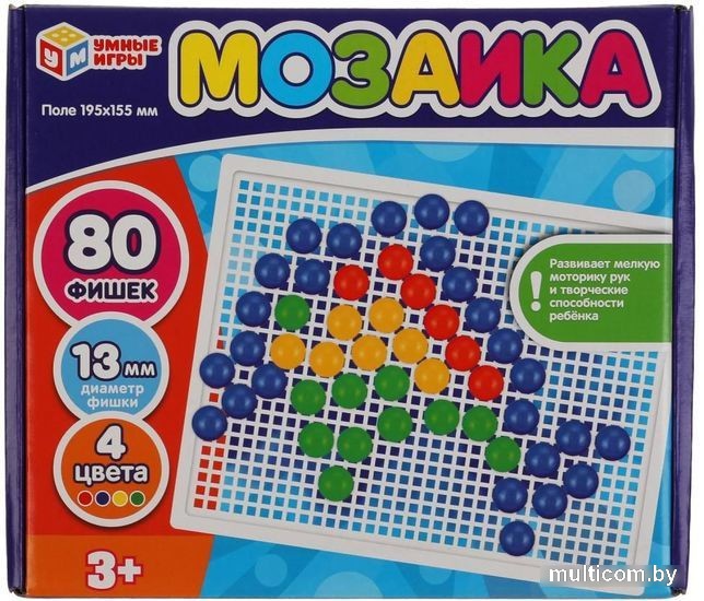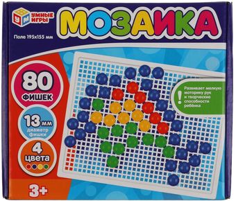 | Информация | Пластиковая мозаика «Умные игры» — интересная развивающая игра для детей: 80 пластиковых фишек; диаметр фишек: 13 мм; 4 цвета. Набор состоит из прямоугольного поля-основы и разноцветных круглых пластиковых деталей, используя которые маленький любознайка сможет собрать самые разные варианты картинок. Игра с мозаикой «Умные игры» способствует развитию: мелкой моторики; творческих способностей; логического мышления; внимания; памяти. |