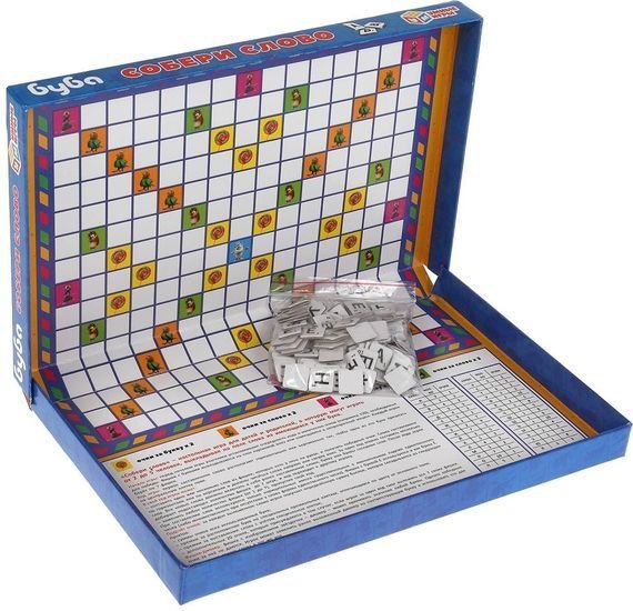 | Информация | Развивающая настольная игра «Буба. Собери слово (словодел)» ТМ «Умные игры» понравится маленькому любознайке. В комплекте: коробка с игровым полем; игровые фишки. Игра рассчитана на 2 – 5 игроков. Правила и задачи игры: у каждого игрока есть на руках 7 фишек с буквами, и с их помощью на игровом поле игрокам предстоит по очереди выкладывать слова. Чтобы победить, игроку нужно как можно быстрее набрать заранее согласованное количество баллов. За каждое сложенное слово игроки получают баллы, точная сумма определяется, исходя из специальных параметров (например, есть премия в 20 баллов за использование сразу всех своих семи фишек за один ход, бонусные баллы за использование цветовых клеток и другие бонусные ситуации). С этой веселой настольной игрой ребенку предстоит погрузиться в увлекательный процесс составления слов. Игра будет очень творческой, и вместе с тем потребует от игроков продемонстрировать логические навыки и стратегическое мышление. Именно поэтому она подходит для игроков любого возраста и быстро увлечет и взрослых, и детей. Благодаря компактным размерам игру удобно брать с собой. |