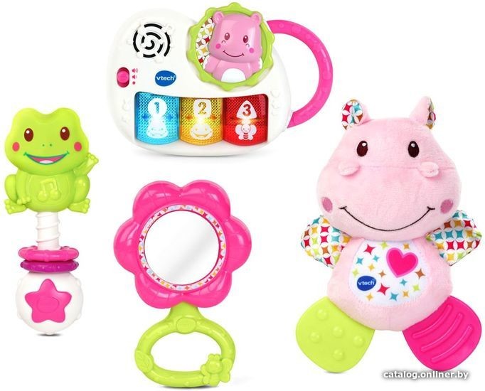 | Информация | Первый подарочный набор от компании — это набор из четырех необходимых игрушек для новорожденных, которые сопровождают раннее развитие детей. Больше не нужно ломать голову над тем, что подарить в качестве первого подарка! Все есть здесь: Электронное пианино имеет три светящиеся клавиши, которые знакомят малыша с цветами, формами, цифрами и животными, а также воспроизводит 45+ песен, мелодий, звуков и фраз. Плюшевый бегемотик сделан из мягкой ткани различной текстуры для развития тактильного восприятия. Мягкие текстурированные лапки бегемота успокоят чешущиеся десны. Погремушка-лягушка имеет удобную для захвата ручку и колечки, которые скользят вперед и назад, помогая ребенку укрепить общую моторику. Безопасное цветочное зеркальце с которым малыш может играть в гляделки для развития самосознания. |