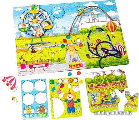 | Информация | Бизиборд «Парк аттракционов» - это многофункциональная игрушка – тренажер для развития мелкой моторики, знакомства с окружающим миром, формирования элементарных бытовых навыков. Бизиборд представляет собой деревянный планшет с тематическими изображениями, условно разделенный на игровые зоны с различными функциональными элементами. «Колесо обозрения» - герои в красочных кабинах приклеиваются к колесу и при воздействии на шестеренки начинает крутиться. «Быстрая горка» - героя на машине нужно провести по лабиринту горки. «Карусель» - для получения изображения карусели, нужно собрать правильно пазл. За каруселью находится другие веселые аттракционы со «Шнуровкой». «Тележка кондитера» - мороженое и сладости выполнены в форме вкладышей, за которыми находятся интересные изображения. «Клоун» - клоун показывает фокусы, нужно шарики вложить на свои места, ориентируясь по цвету. Игры и занятия с бизибордом развивают мышление, память, воображение, зрительное и тактильное восприятие, стимулируют мелкую моторику и координацию движения. Игры с Бизибордом «Парк аттракционов» приносят только пользу! Бизиборд «Парк аттракционов» представляет собой деревянный планшет с тематическими изображениями, набор деталей – пазлов, плашка с комплектом из 6 деталей с липучками, плашка с комплектом из 12 деталей – вкладышей, набор пластиковых ручек, шнурок. |