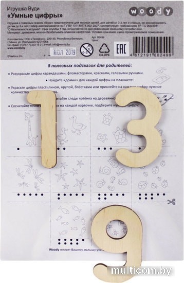 | Информация | С набором «Умные цифры» обучение больше похоже на игру. Учиться в игровой форме детям намного увлекательнее, так они более усидчивы, с удовольствием вовлекаются в процесс и познают новую информацию. Найдите с ребенком на планшете «домик» для каждой цифры и вставьте её туда – так будет развиваться тактильные ощущения и лучше запомниться форма каждой цифры. Каждый «домик» имеет специальную выемку, для удобного доставания цифр. В набор входит 10 деревянных цифр: от 0 до 9. Высота цифр составляет 6,5 см, что облегчает восприятие каждой отдельной цифры.Начать изучение цифр можно с простой игры: где у тебя ручки и ножки? А сколько у тебя их? Сколько тебе лет? Постепенно усложняйте загадки. В такой форме ребенку будет легче изучать цифры, ведь так будет задействовано логическое мышление, воображение, смекалка. Во время изучения можно погрузиться в творчество и ярко разукрасить каждую фигуру цветными карандашами, фломастерами, гуашью, гелевыми ручками, или украсить поверхность различными крупами, блестками, пластилином, приклеить на цифры пуговицы. На инструкции есть 5 полезных подсказок для родителей и 10 игровых карточек, которые можно вырезать. На карточках нарисованы зверята и насекомые, а количество точек на рисунке соответствует количеству природных обителей на каждой карточке. Сосчитайте точки и животных, и подберите для них нужную цифру из набора. Игровые карточки также можно разрисовать.Планшет украшен ярким рисунком котенка и его лапок. Посчитайте с ребенком, сколько лапок нарисовано на доске и выложите нужную цифру. Для цветной картинки используется экологическая и безопасная краска, не выделяющая токсины. |