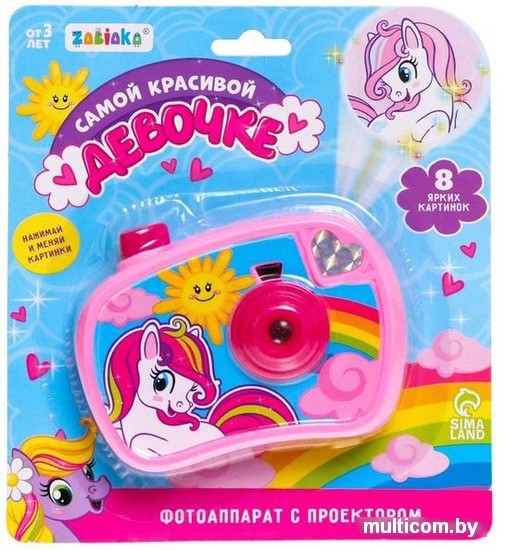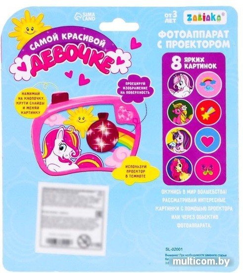 | Информация | Фотоаппарат с проектором «Самой красивой девочке» развивает воображение, моторику, внимание и кругозор. Как играть? Нажимайте на кнопочку, крутите слайды и меняйте картинку. Проецируйте изображение на поверхность. Используйте проектор в темноте. |