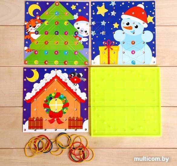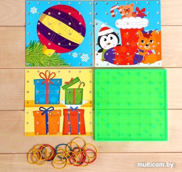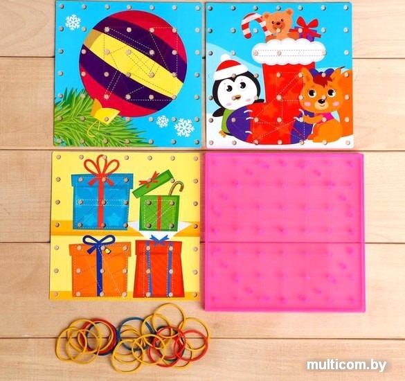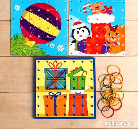 | Информация | Геоборд — это очень простая и интересная игрушка. Она развивает логику, мышление, мелкую моторику рук. Представляет собой доску со штырьками, к которой прилагаются резиночки и картинки. Резиночки нужно натягивать на штырьки в соответствии со схемами (идут в комплекте). Таким образом, у вас будут получаться интересные новогодние рисунки. |
