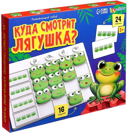 | Информация | ? Развивающий игровой набор Zabiaka IQ Куда смотрит лягушка / 9716590 включает в себя 16 штук лягушек размером 4.5?4.5?0.9 см. ? В комплекте также имеются карточки размером 6.5?4.3 см. ? Этот набор поможет развить у детей навыки логики и внимания. |