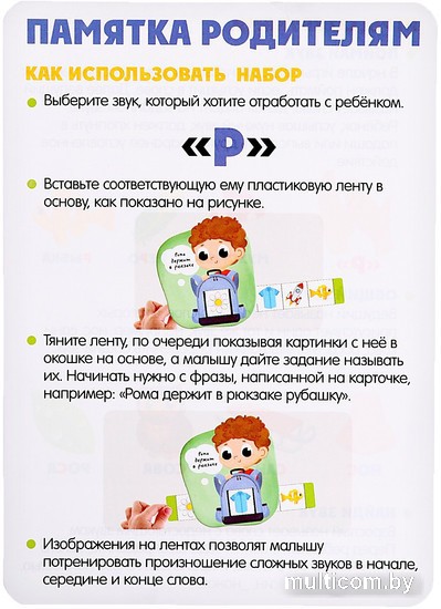 | Информация | ? Развивающий игровой набор Zabiaka IQ Назови звук 9380732 поможет малышу тренировать речь, произношение звуков, расширять словарный запас и развивать внимательность. В комплекте 6 игровых основ, 18 пластиковых лент и памятка для родителей. ? Как использовать набор: вставьте ленту в основу, потяните за нее, показывая картинки малышу и называя предметы вслух. Задача малыша - повторять слова за вами. ? Игры со звуком: - Поймай звук: ведущий называет звук, который ребенок должен поймать, если услышит его в слове. - Общий звук: ведущий называет несколько слов с одним и тем же звуком, задача малыша - определить общий звук и назвать его. - Найди звук: взрослый называет слова с недостающим звуком, задача ребенка - определить, какого звука не хватает в слове и произнести его полностью. ? Комплектация: односторонние основы - 6 штук, размер 14.5?16.5 см; односторонние пластиковые ленты - 18 штук, размер 23?4 см (размер картинки на ленте - 4?4 см); памятка для родителей. |