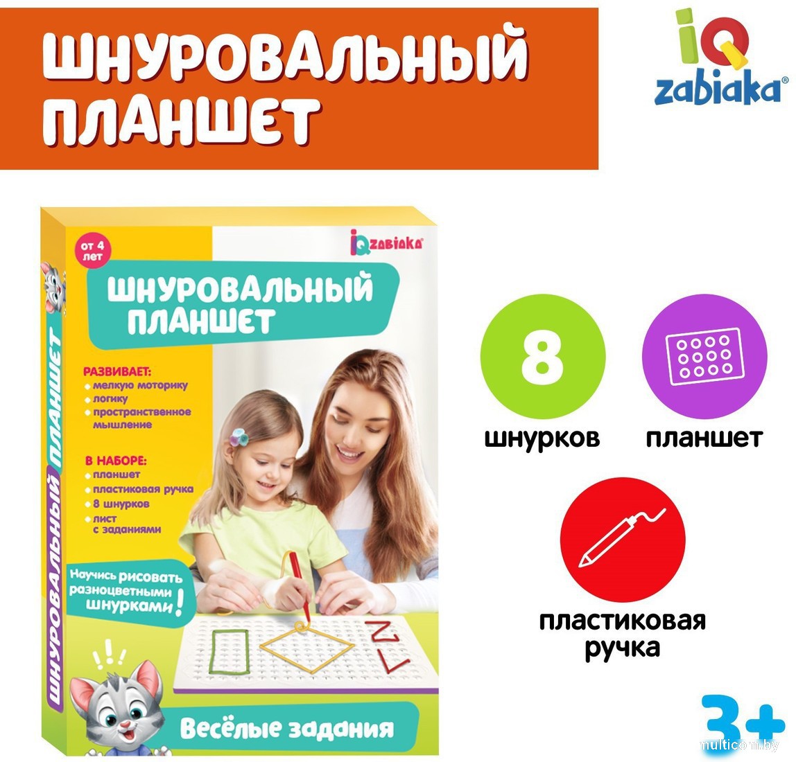 | Информация | - Zabiaka IQ Шнуровальный планшет - это занимательная развивающая игра, которая надолго увлечет малыша. - Резиновые мембраны на отверстиях позволяют быстро составлять изображение и также быстро вынимать шнурки обратно. - Благодаря 8 ярким шнуркам длиной 80 см картинки получаются полноценными и разнообразными. - Пластиковая ручка помогает удобно фиксировать шнурки на планшете и создавать объемные изображения. - Большой размер планшета дает возможность создавать целые картины. |