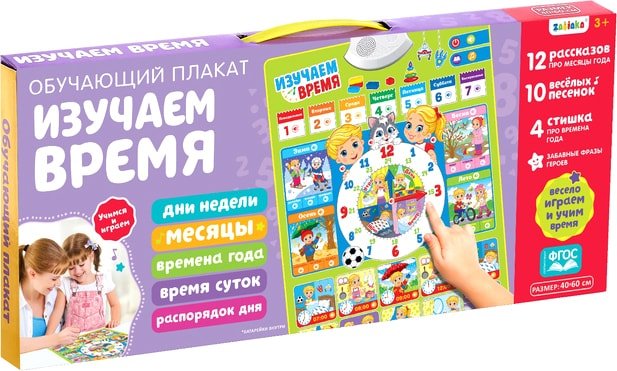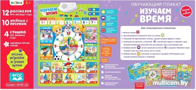 | Информация | Плакат воспроизводит: - 12 рассказов о месяцах, - 10 весёлых песенок, - 4 стишка про времена года, - забавные фразы героев. |