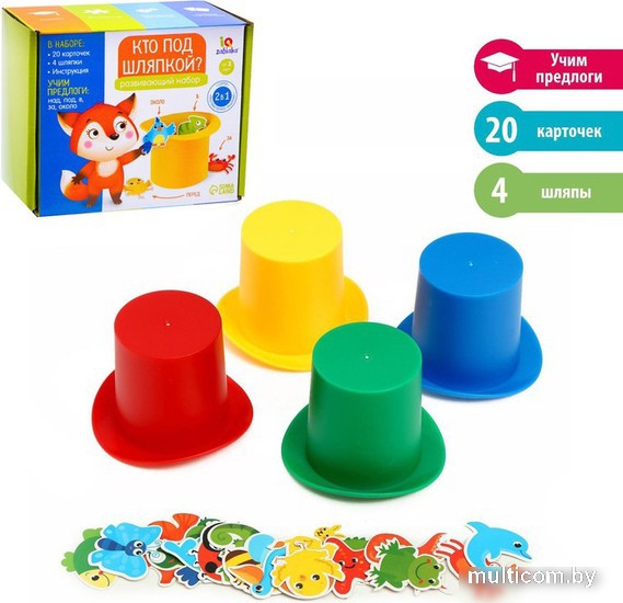 | Информация | С развивающим набором «Кто под шляпкой» ребёнок научится ориентироваться в пространстве. Познакомится с понятиями: «над», «под», «в», «за», «между», «перед», «внутри». Малыш будет выполнять задания на карточках и правильно размещать фигурки относительно друг друга и шляпок. |