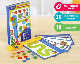 | Комплектация | - Магнитный жезл. - Магнитные фишки, 20 шт. - Картинки с заданиями, 10 шт. |