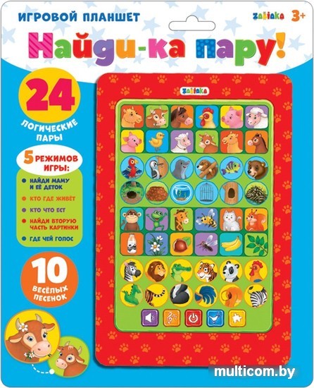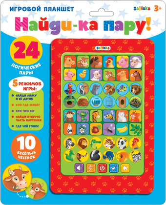 | Информация | Развивающий планшет «Соединяй пары» развивает зрительное восприятие, логическое мышление и память. 5 режимов игры: Найди маму и её деток. Кто где живёт. Кто что ест. Найди вторую часть картинки. Где чей голос. |