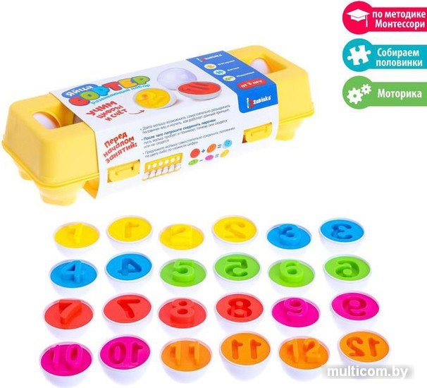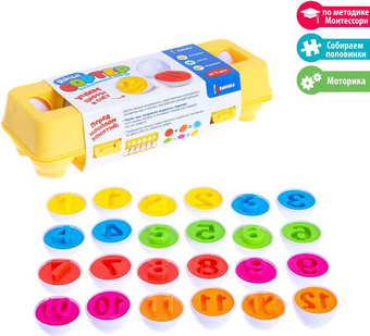 | Информация | Набор «Сортер: яйца» поспособствует развитию мелкой моторики и логического мышления. В процессе игры малыш познакомится с цифрами и названиями цветов. Как играть: Дайте малышу возможность самостоятельно разъединить половинки яиц. После чего попросите соединить парочки: пусть малыш пробует и понимает, почему они сходятся или не сходятся. Предложите малышу самостоятельно соединить половинки по цвету либо по цифре. |
