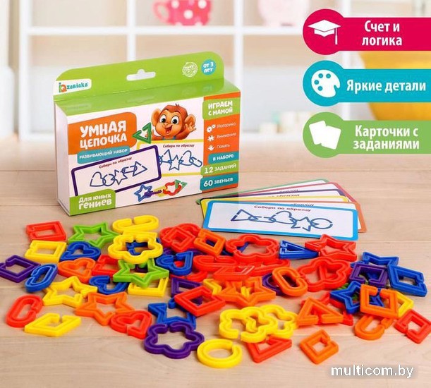 | Информация | С набором «Умная цепочка» ребенок научится считать и узнает названия основных цветов. Игра развивает воображение, мелкую моторику и внимание. Как использовать набор? Достаньте из коробочки все содержимое: 60 цветных звеньев, 12 логических заданий. Возьмите карточку и попросите ребенка прицепить нужное количество звеньев в соответствии с заданием. Усложняйте задания, попросите малыша выполнить их на скорость. Играйте командами, устраивайте веслые соревнования. Размер деталей: 4x3.5x0.5 см - 5.5x5x0.5 см. |