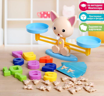 | Комплектация | - 10 цифр (пластмасс): 4,5 ? 1,5 ? 5 см. - 19 котиков (пластмасс): 2,5 ? 1 ? 3 см. - Весы. - 20 двусторонних карточек с заданиями (картон): 9 ? 6 см. |