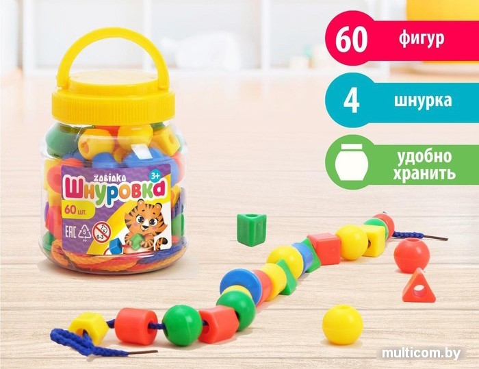 | Информация | Пластмассовая шнуровка с яркими бусинками станет любимой игрой вашего малыша. Как играть Попросите малыша нанизывать бусины одного цвета или задайте определённую комбинацию. При нанизывании каждой бусины проговаривайте вместе с малышом названия оттенков. Игра способствует развитию мелкой моторики, логики и усидчивости. |