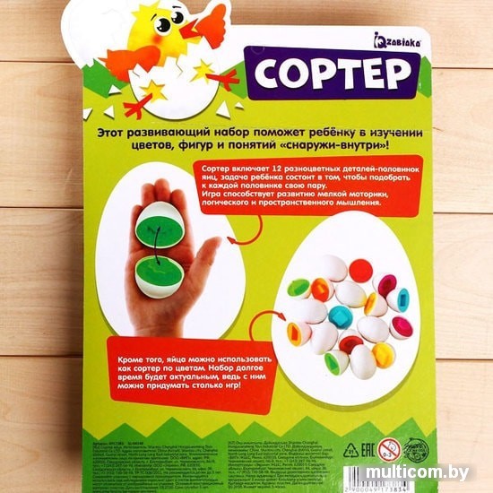 | Комплектация | Сортер включает 12 разноцветных деталей-половинок яиц, задача ребенка состоит в том, чтобы подобрать к каждой половинке свою пару. Игра способствует развитию мелкой моторики, логического и пространственного мышления. |