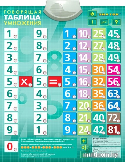 | Информация | Оригинальная форма подачи материала на этом звуковом плакате позволяет легче выучить таблицу умножения! Плакат сам подскажет ребёнку, как им пользоваться. Для проверки знаний имеется кнопка экзамен. В отличие от других таблиц, здесь невозможно сжульничать и подсмотреть правильный ответ. Возможно как самостоятельное обучение, так и изучение с преподавателем. А если ребёнок утомится от занятий, он может вместе с плакатом исполнить весёлую песенку Владимира Шаинского «Дважды два – четыре». Плакат имеет влагозащитную поверхность и может располагаться на столе или на стене. Размер плакатов 470х585 мм. Для экономии батареек предусмотрено автоматическое выключение плаката при отсутствии активных действий в течение 5 минут. Предусмотрена регулировка громкости воспроизведения звуков. |
