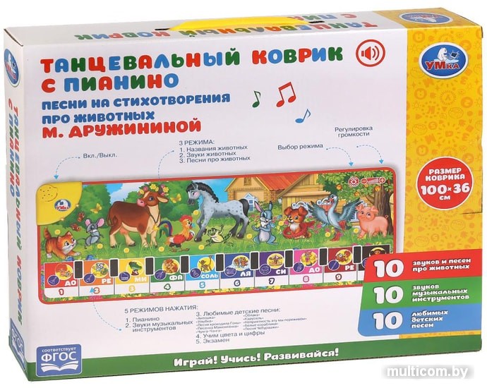 | Информация | Яркий коврик-пианино украсит детскую комнату и будет способствовать эффективному обучению и развитию ребенка. Малыш с удовольствием будет не только играть на нем, но и весело танцевать. На коврике изображены животные и музыкальные нотки. У коврика есть 3 режима: 1) "Названия животных"; 2) "Звуки животных";3) "Песни про животных".В игровой форме изучаем ноты, знакомимся с музыкальными инструментами, учим животных и их звуки, запоминаем веселые стихотворения Марины Дружининой. Так же воспроизводит "10 любимых детских песен про животных" (подборка из лучших песен студии "Союзмультфильм") + "10 звуков музыкальных инструментов" + "10 звуков и песен про животных". Есть функция включения и выключения звука. Размер коврика 100х36 см. |