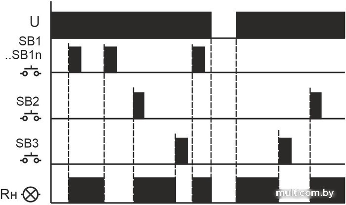 | Информация | Предназначено для управления одной нагрузкой: включения/выключения освещения, электроустановок и т.п. из нескольких мест выключателями кнопочного типа, параллельно соединенными между собой. У реле три независимых входа управления, что позволяет использовать для группового режима работы. Реле объединяются в группы, включение и выключение групп реле осуществляется по групповым входам, а управление отдельным реле в группе - по индивидуальному входу. Например, включение и выключение освещения всех этажей гостиницы (групповые входы) или управление освещением каждого этажа (индивидуальные входы). Особенности: гальваническая развязка между исполнительными реле (сухой контакт) и цепью питания; память контактов; возможно подключение выключателей кнопочного типа с подсветкой; максимальный ток нагрузки 16 А; для исключения самопроизвольного срабатывания реле от наводок силовых цепей питания рекомендуется между питающим и управляющим входом реле (контакт 1 и контакты 4 и 9) установить конденсатор емкостью 0.15…0.33 мкФ 275 АС. Область применения Освещение проходных помещений: длинных коридоров, лестничных маршей и т.д. (включение на входе, выключение на выходе), управление включением/ выключением электроустановки. |