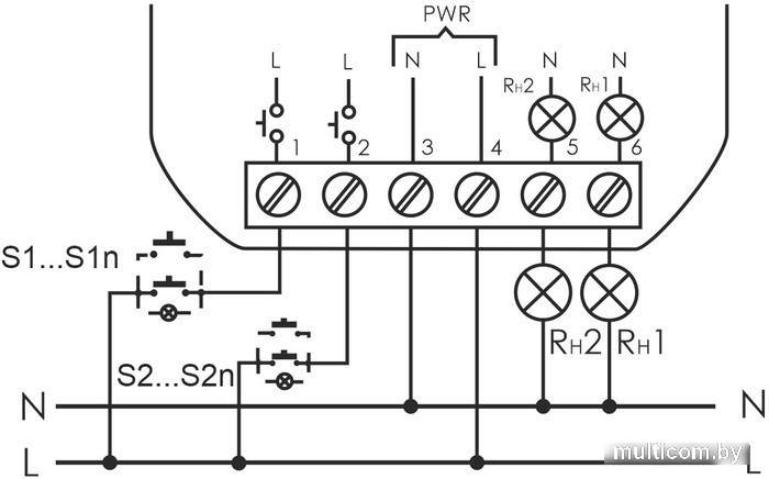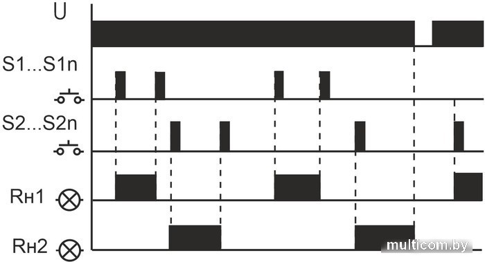 | Информация | Предназначено для управления двумя нагрузками по двум независимым управляющим входам, включение/выключение освещения, электроустановок и т.п. из нескольких мест выключателями кнопочного типа, параллельно соединенными между собой. Особенности: раздельное управление двумя нагрузками, на каждую нагрузку своя группа выключателей; нет памяти контактов; возможно подключение выключателей кнопочного типа с подсветкой; максимальный ток нагрузки 2х8 А. Область применения Освещение проходных помещений: длинных коридоров, лестничных маршей и т.д., управление включением/ выключением электроустановок. Принцип работы Включение, либо выключение нагрузок осуществляется подачей электрического импульса на входы управления реле. Замыканием по входу S1, S2 любого из выключателей кнопочного типа, параллельно соединенных между собой, осуществляется независимое управление соответствующими нагрузками Rн1,Rн2. |
