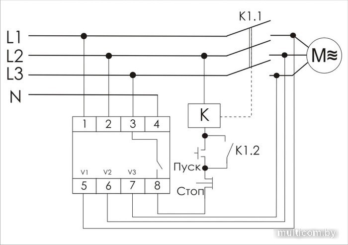 | Информация | Реле контроля фаз CKF-BT предназначено для защиты электродвигателей и электроустановок, подключенных к трёхфазной сети, в случаях:отсутствия напряжения хотя бы в одной из фаз; асимметрии напряжения; снижения напряжения менее 160 В; повреждения контактов контактора; обрыв нулевого провода. |