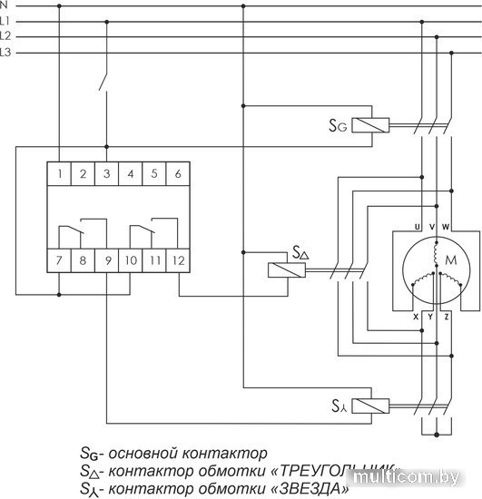 | Информация | Для управления контакторами, переключающими обмотки электродвигателей со схемы «ЗВЕЗДА» при пуске на схему «ТРЕУГОЛЬНИК» в рабочем режиме. Область применения Во всех отраслях промышленности, строительстве, ЖКХ, энергетике, транспорте и т.д.., где применяются электродвигатели большой мощности. Особенности Для переключения обмоток трёхфазных двигателей большой мощности со схемы «ЗВЕЗДА» в «ТРЕУГОЛЬНИК» при пуске. Время пуска 1-1000 с. Принцип работы Реле времени PCG-417 имеет 2 релейных выхода. Каждый управляет отдельным контактором. В момент пуска его первый выход включает контактор S? (замыкаются контакты 7-9) и обмотки электродвигателя подключаются по схеме «ЗВЕЗДА», что снижает пусковой ток в несколько раз. По окончании времени выхода двигателя на рабочий режим (время t1) наступает пауза (t2), когда оба контактора выключены, затем включается контактор S? (замыкаются контакты 10-12), включающий обмотки по схеме «ТРЕУГОЛЬНИК». |
