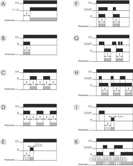 | Информация | Для включения / выключения нагрузки в системах автоматики на заданный отрезок времени. Выдержка времени отсчитывается с момента подачи питания или замыкания (размыкания) управляющего контакта. Особенности Многофункциональное (10 функций). Область применения В вентиляционных, отопительных, осветительных, сигнализационных и т.п. системах, где необходимо включение нагрузки на установленный отрезок времени. Принцип работы Установленные диапазоны времени отсчитываются с момента включения питания. В установленном диапазоне времени при включенном питании реле не реагирует на изменение диапазона отсчитываемого отрезка времени. Работа с измененным диапазоном времени и функции начинается после повторного включения питания или при кратковременном нажатии кнопки RESET после совершения изменений. Если при включенном питании изменяется функция на другую функцию, и при этом нажать кнопку START, то устройство выполнит первоначально установленную функцию, а затем отменит ее (переключит на новую функцию). Очередное нажатие кнопки START вызовет выполнение новой функции. |