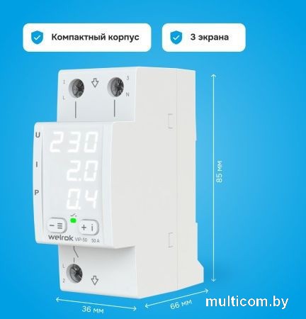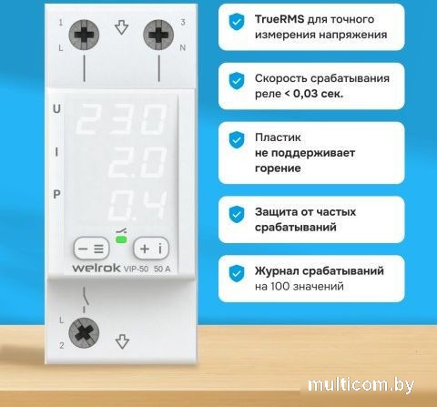| Информация | Welrok VIP Многофункциональное реле Welrok VIP защищает оборудование от скачков и провалов напряжения, последствий обрыва нулевого провода и превышения тока или полной мощности. Реле отключает нагрузку, если напряжение, ток или мощность выходит за установленные пределы и автоматически включает нагрузку, когда значение параметра вернется в норму. Гарантия 10 лет На все реле Welrok действует 10-летняя гарантия от производителя. 3 дополнительных преимущества, которые дает контроль по току в реле: 1. Возможность точного ограничения мощности нагрузки; 2. Возможность равномерно распределить нагрузку по фазам; 3. Визуальный контроль за текущим состоянием нагрузки. Максимальная функциональность Welrok VIP red — компактное реле на 2 модуля с мощным функционалом и корпусом, не поддерживающим горение: ? Позволяет выбрать, по какому из параметров — ток или мощность — будет срабатывать защита вместе с защитой по напряжению. ? Скорость срабатывания реле — не более 0,03 сек. ? TrueRMS для точного измерения напряжения Для уменьшения количества срабатываний: ? Защита от частых срабатываний ? Регулируемый гистерезис ? Регулируемая задержка включения нагрузки ? Профессиональная модель отключения при выходе напряжения за пределы Для анализа питающей сети по характеру аварийных срабатываний: ? Энергонезависимый журнал срабатываний на 100 значений Для комфортной и безопасной эксплуатации: ? Поправка напряжения и тока на экране ? Регулировка яркости экрана ? Защита от перегрева ? Блокировка кнопок ? Сохранение настроек в энергонезависимой памяти Простая установка и удобное управление Реле отображает три параметра сети одновременно. Реле подключается без транзита нуля. Настройка реле осуществляется с помощью двух кнопок: « ? » « ? » (меню) и « ? » « ?? ». |
