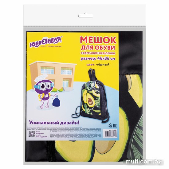 | Информация | Мешок для обуви — необходимый аксессуар в школе. Подходит как для обуви, так и для физкультурной формы и сменной одежды для факультативных занятий. Затягивается двумя шнурками. Можно носить на плечах за спиной. Мешок имеет одно вместительное отделение и большой боковой карман на молнии. Передний карман может выполнять роль полноценного отделения, с возможностью отдельного хранения уличной и сменной обуви, а также физкультурной формы и одежды для внешкольных занятий. Наличие двух ручек позволяет переносить мешок в руках и подвешивать на крючок в школе. Мешок для обуви упакован в плотный ПЭТ пакет |