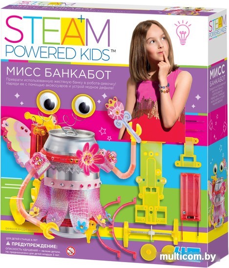 | Информация | Превратите использованную жестяную банку в робота-девочку, нарядите ее с помощью аксессуаров и устройте модное дефиле! Не нужно быть волшебником, чтобы оживлять предметы, просто соберите набор «Мисс Банкабот». Батарейка подает мотору электричество, мотор с большой скоростью крутит червячную передачу. Она выполняет роль редуктора: поворачивает шестерню с более низкой скоростью. Шайбы на концах оси — это просто круги с выступами. Когда шайба вращается, выступ крутится. Когда мотор работает, шайбы заставляют стороны робота подниматься по очереди, и он шагает. |