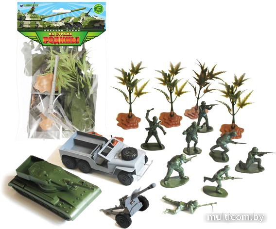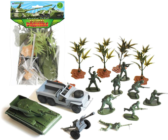 | Комплектация | машина большая военная, танк, пушка, набор солдатиков и четыре куста на подставках |