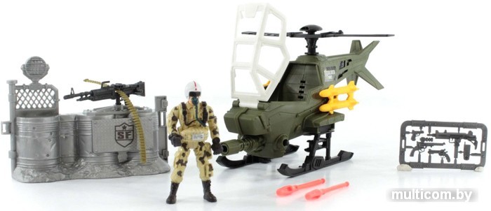 | Информация | Игровой набор "Cолдаты Стремительная атака" от бренда Chap Mei- это лучший подарок для ребенка. В наборе идет многофункциональный вертолет 26 см, у которого вращаются лопасти на 360 градусов и кабина пилота открывается вверх. За штурвал вертолета можно разместить фигурку пилота 10 см (подвижные: руки, ноги) .На нижней части вертолета установлена ракетная пушка, выстреливающая ракетами (2 шт в наборе). Кроме вертолета в набор входит оборонительное сооружение с ручным пулеметом, из- за которого можно ввести наблюдение солдатом с комплектом оружия, которые фиксируются в руке фигурки. |
