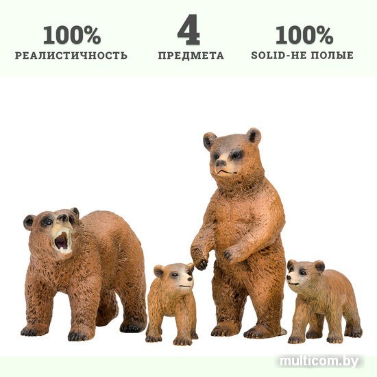 | Информация | Фигурки семья медведей являются уменьшенными копиями реальных животных. Фигурки выполнены из высококачественного литого цветного пластика. Игрушка не боится механического воздействия, и надолго сохранят первоначальный внешний вид. Мелкие детали фигурок прорисовываются вручную безопасными и устойчивыми к внешнему воздействию красителями. Данная технология позволяет получить максимальное сходство с животным. В комплект входят: медведь, медведица, 2 медвежонка. К набору идеально подойдут другие животные бренда, выполненные в едином стиле. Набор идеально подходит и в качестве обучающего материала и для увлекательных сюжетных игр детей. Игры с фигурками помогут ребенку познакомиться с миром животных, развивают мышление, фантазию, учат бережно относиться к окружающему миру. Набор фигурок – прекрасный подарок на День рождения или любой другой праздник. |