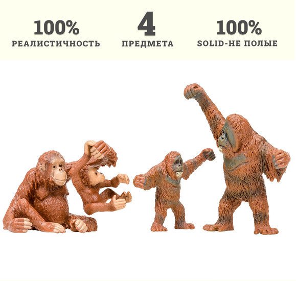 | Информация | Фигурки семья орангутангов являются уменьшенными копиями реальных животных. Фигурки выполнены из высококачественного литого цветного пластика. Игрушка не боится механического воздействия, и надолго сохраняет первоначальный внешний вид. Мелкие детали фигурок прорисовываются вручную безопасными и устойчивыми к внешнему воздействию красителями. Данная технология позволяет получить максимальное сходство с животным. В комплект входят: орангутанг (12х3х11 см), самка орангутанг (8х2х6 см), 2 детеныша орангутанга (9х7х6 см; ; 4х4х5,5 см). К набору идеально подойдут другие животные бренда, выполненные в едином стиле. Набор идеально подходит и в качестве обучающего материала и для увлекательных сюжетных игр детей. Игры с фигурками помогут ребенку познакомиться с миром животных, развивают мышление, фантазию, учат бережно относиться к окружающему миру. Набор фигурок – прекрасный подарок на День рождения или любой другой праздник. Рекомендуется для девочек и мальчиков от 3 лет. |