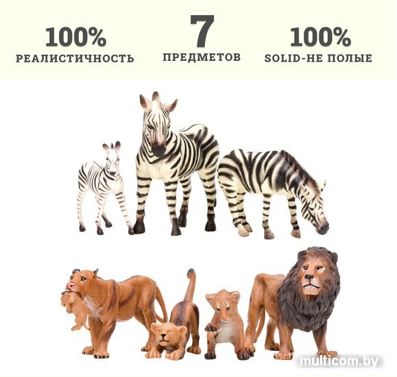 | Информация | Фигурки львов и зебр являются уменьшенными копиями реальных животных. Фигурки выполнены из высококачественного литого цветного пластика. Игрушка не боится механического воздействия, и надолго сохраняет первоначальный внешний вид. Мелкие детали фигурок прорисовываются вручную безопасными и устойчивыми к внешнему воздействию красителями. Данная технология позволяет получить максимальное сходство с животным. В комплект входят: лев (13,4х4х8 см), львица (13х3х6 см), 2 львенка (8,5х3,4х5 см 9х2,5х6 см), дерово (10х3х2 см), 2 зебры (12х2,5х7 см; 12х3х13 см), зебренок (8х2х8 см), дерево (10х3х2 см), камень (4х4х2 см). К набору идеально подойдут другие животные бренда, выполненные в едином стиле. Набор идеально подходит и в качестве обучающего материала и для увлекательных сюжетных игр детей. Игры с фигурками помогут ребенку познакомиться с миром животных, развивают мышление, фантазию, учат бережно относиться к окружающему миру. Набор фигурок – прекрасный подарок на День рождения или любой другой праздник. |