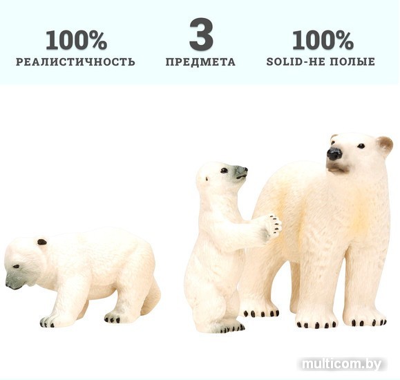 | Информация | Фигурки белая медведица и медвежата являются уменьшенными копиями реальных животных. Фигурки выполнены из высококачественного литого цветного пластика. Игрушка не боится механического воздействия, и надолго сохраняет первоначальный внешний вид. Мелкие детали фигурок прорисовываются вручную безопасными и устойчивыми к внешнему воздействию красителями. Данная технология позволяет получить максимальное сходство с животным. В комплект входят: белая медведица (10,5х4,5х7 см) и 2 медвежонка (7х3,5х3,5 см; 4х2,5х6 см). К набору идеально подойдут другие животные бренда, выполненные в едином стиле. Набор идеально подходит и в качестве обучающего материала и для увлекательных сюжетных игр детей. Игры с фигурками помогут ребенку познакомиться с миром животных, развивают мышление, фантазию, учат бережно относиться к окружающему миру. Набор фигурок – прекрасный подарок на День рождения или любой другой праздник. Рекомендуется для девочек и мальчиков от 3 лет. |
