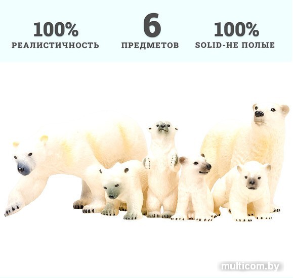 | Информация | Фигурки семьи белых медведей являются уменьшенными копиями реальных животных. Фигурки выполнены из высококачественного литого цветного пластика. Игрушка не боится механического воздействия, и надолго сохраняет первоначальный внешний вид. Мелкие детали фигурок прорисовываются вручную безопасными и устойчивыми к внешнему воздействию красителями. Данная технология позволяет получить максимальное сходство с животным. В комплект входят: семья белых медведей 6 штук (12,5х4,5х7 см; 10,5х4,5х7 см; 7х3,5х3,5 см; 7х3,5х3,5 см; 4х3х3 см; 6х2,5х4 см) К набору идеально подойдут другие животные бренда, выполненные в едином стиле. Набор идеально подходит и в качестве обучающего материала и для увлекательных сюжетных игр детей. Игры с фигурками помогут ребенку познакомиться с миром животных, развивают мышление, фантазию, учат бережно относиться к окружающему миру. Набор фигурок – прекрасный подарок на День рождения или любой другой праздник. |
