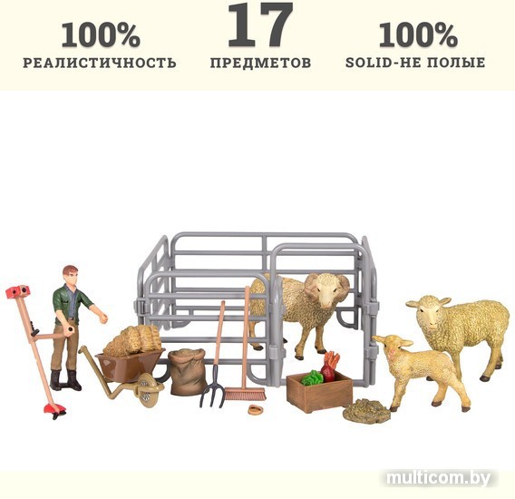 | Информация | ОсобенностиНабор фигурок являются уменьшенными копиями реальных животных, людей и зданий. Игрушка не боится механического воздействия, и надолго сохранят первоначальный внешний вид. Мелкие детали фигурки прорисовываются вручную устойчивыми к внешнему воздействию красителями. Данная технология позволяет получить максимальное сходство с реальными животными. Под ногами фигурок имеется имитация земли/травы для большей устойчивости фигурки. В комплект входит 17 предметов: загон (15х10), овцы 3 шт (10х7х3,5; 7х5х2,5; 10х7х3,5), фигурка фермера (3х6х3), трава (3х2х2), мешок (3х3,5х2), сено (4х3х2), овощи 3 шт. (2,5х2х2; 3,5х1х1; 3,5х1х1), ящик (4х3,5х3,5), щетка (5х3х0,5), вилы (5х1,5х0,5), газонокосилка (6х3х3), щетка для чистки животных (0,8х0,8х0,3), тележка (7х3,5х3,5). Комплектация Ферма, овцы, фермер, инвентарь |
