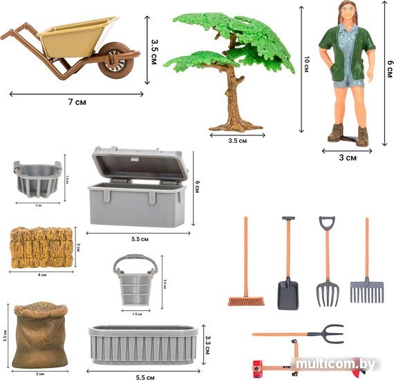 | Информация | ОсобенностиИгровой набор является уменьшенными копиями реальных животных, людей и зданий. Игрушка не боится механического воздействия, и надолго сохранят первоначальный внешний вид. Мелкие детали фигурки прорисовываются вручную устойчивыми к внешнему воздействию красителями. Данная технология позволяет получить максимальное сходство с реальными животными. Под ногами фигурок имеется имитация земли/травы для большей устойчивости фигурки. В комплект входит 20 предметов: загон (20х16х14), слоненок (9х5х3,5), тигр (15х7х4), кенгуру (9х9х3,5), фигурка фермера (3х6х3), мешок (3х3,5х2), сено (4х3х2), тележка (7х3,5х3,5), ящик с крышкой (5,5х6х1), ящик (5,5х3,3х1), ведро (1,5х2,5), кормушка (2х1,5), дерево 2 шт (3х10х3; 3,5х10х3), щетка (5х3х0,5), лопата (5х1,5х0,5), вилы 2 шт (5х1,5х0,5; 5х1,5х0,5), грабли (5х3х0,5), газонокосилка (6х3х3). Комплектация Ферма, тигр, слоненок, кенгуру, фермер, инвентарь |