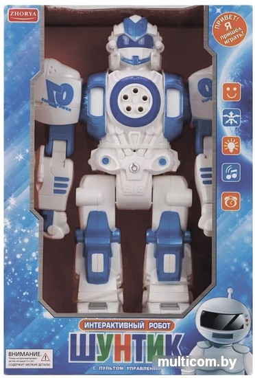 | Информация | Радиоуправляемый интерактивный робот «Шунтик» со светозвуковыми эффектами. Игрушка распознаёт 23 голосовые команды, выполняет 11 команд от пульта управления, поёт 4 песни и танцует. «Шунтик» знает разные игры, сказки, скороговорки и сможет научить ребёнка алфавиту. Игрушка умеет стрелять ракетами, а также двигать головой, туловищем и руками. Робот ходит по направлениям вперёд и назад, осуществляет повороты направо и налево. А ещё «Шунтик» показывает время и может работать в качестве будильника. Игрушка работает от 6-ти батареек типа АА на 1,5 V (4 для робота, 2 для пульта). Элементы питания не входят в комплект. |