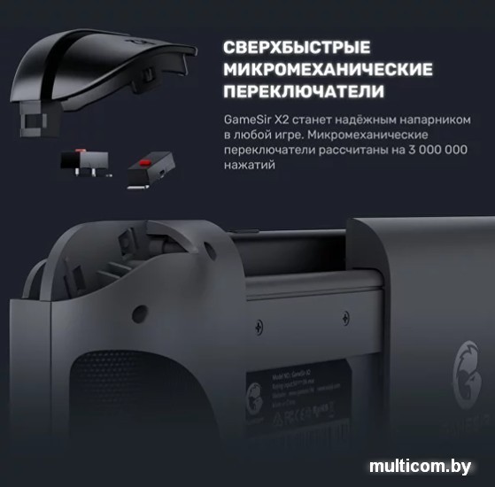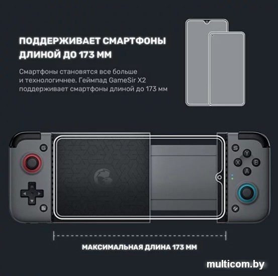 Информация | GameSir X2 Bluetooth – это мобильный игровой контроллер, который с лёгкостью превратит ваш смартфон в портативную игровую консоль. Совместим со смартфонами длиной до 173 мм на Android и iOS. Благодаря компактному и эргономичному форм-фактору, ёмкому аккумулятору и удобному кейсу геймпад станет вашим компаньоном в любой точке мира. Играйте в игры MFi, Apple Arcade или в облачных сервисах как профессиональные игроки с помощью быстрых кнопок на микромеханических переключателях и стиков киберспортивного уровня. Сохраняйте кнопкой screenshot самые яркие и триумфальные моменты, чтобы поделиться ими с друзьями СМАРТФОНЫ ДЛИНОЙ ДО 173 ММ |