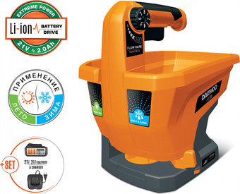 | Информация | Сеялка-разбрасыватель аккумуляторная: - Применение в теплый сезон. Обеспечивает непрерывное равномерное разбрасывание семян трав, минеральных гранулированных удобрений. Подходит для разбрасывания корма на акваферме или птицефабрике. - Применение в зимний период. Обеспечивает эффективное разбрасывание каменной соли и антиобледенителя. - Регулировка производительности. 6 режимов скорости разбрасывания, 8 режимов объема подаваемого материала и изменение угла рассеивания от 60 до 120° позволяют максимально эффективно выполнять работу. - Корпус из ударопрочного пластика. Корпус сеялки-разбрасывателя выполнен из ударопрочного пластика. - Полный комплект для начала работы. Универсальная Li-ion батарея 21В и зарядное устройство в комплекте. - Полезный объем чаши 3 л. - Макс. дальность рассеивания, 3 м - Угол рассеивания, 60-120° - Регулировка скорости разбрасывания 1-6 |