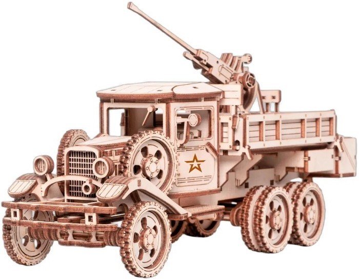 | Информация | Сборная модель из дерева военного грузовика "Зенитная установка" от фабрики "Армия России". Деревянный конструктор "Армия России" выполнен из березовой фанеры высшего сорта. Все детали вырезаны и находятся на деревянной карте, из которой остается их только выдавить пальцем. Деревянный грузовик собирается с использованием клея. Собранную модель вы можете использовать как игрушку из дерева. У собранной модели из дерева вращаются колеса, руль и зенитная установка в кузове, открываются дверцы кабины, капот и крышки ящиков, откидываются боковые борта кузова. Имеется подвеска с амортизацией, которая позволит ездить по полу и неровностям. При желании игрушку можно раскрасить акриловыми красками. Автомобиль порадует вас своей детализацией! |