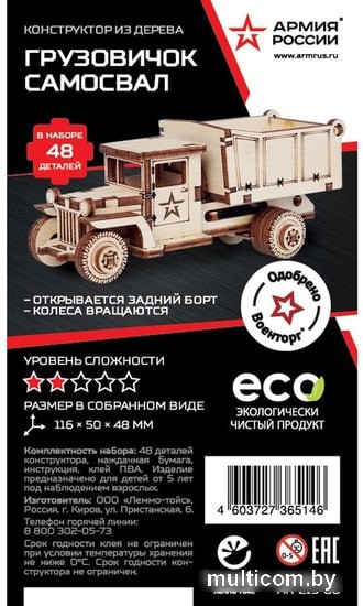 | Информация | Экологически чистые, развивающие конструкторы помогут вашему ребенку развить мелкую моторику рук, воображение, пространственное мышление, логику и предметное моделирование. Набор Советский грузовик ЗИС-5ВБ с кузовом подходит для ребенка от 5 лет. Все детали выполнены из качественной древесины и имеют сильный насыщенный запах дерева. Наборы укомплектованы клеем ПВА и наждачной бумагой. Любой конструктор после сборки можно раскрасить акриловыми и гуашевыми красками, но даже без этого в результате получается полноценная красивая игрушка с подвижными элементами. У собранной модели вращаются колеса. Количество деталей: 52 шт. Размеры: 116х50х48 мм. Комплектность набора: клей ПВА, наждачная бумага, подробная инструкция. Вес товара: 70 г. |