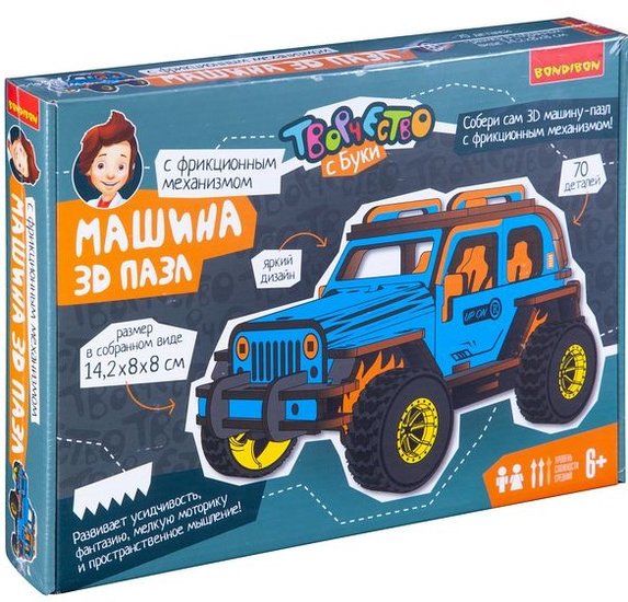| Информация | С помощью яркого и оригинального 3D-пазла ребенок сможет самостоятельно собрать внедорожник с фрикционным механизмом, который позволит машинке при создании определенной силы трения-скольжения, быстро ездить вперед. Пазл состоит из 70 деталей, легко собирается. Все необходимое для сборки в комплекте. Игра с объемным пазлом поможет ребенку в развитии усидчивости, фантазии, мелкой моторики и пространственного мышления. |