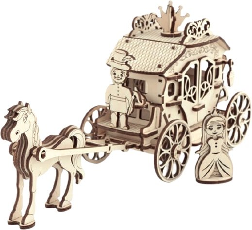 | Информация | В набор входит фигурка лошади, кучера и принцессы. У собранной модели вращаются колеса, открываются дверцы кареты. |