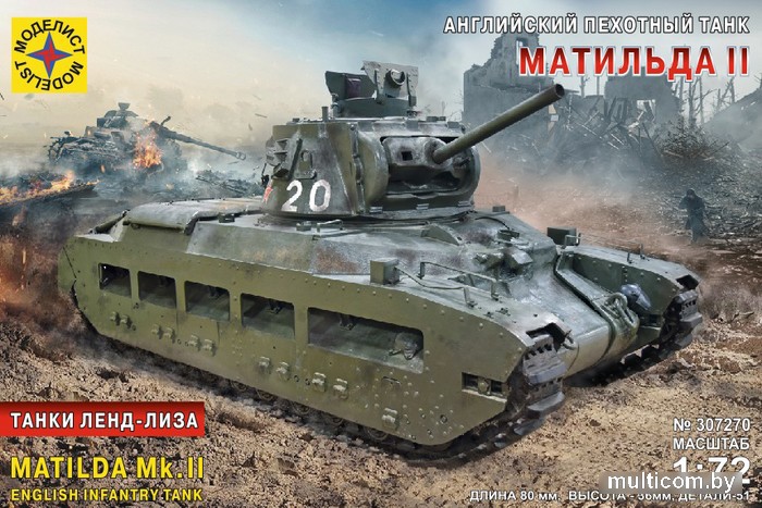 | Информация | Пехотный танк «Матильда II» (англ. Infantry Tank Mk.II «Matilda II») — средний пехотный танк армии Великобритании периода Второй мировой войны. Активно и успешно использовался британской армией в ходе боевых действий в Африке, также в значительных количествах поставлялся в СССР и Австралию. «Матильда» - единственная модель танка в мировой истории, названная женским именем. Состоял на вооружении танковых частей СССР. По программе «Лэнд-Лиз» первые 20 единиц танков «Матильда II» прибыли в Архангельск с морским караваном PQ-1 11 октября 1941 года. Всего из Англии было отправлено 1084 штук, часть была потеряна в ходе транспортировки по морю северными конвоями. Красная Армия получила 918 машин. Танки имели мощное бронирование на уровне советских тяжёлых танков КВ, которое увеличивало выживаемость танка и экипажа на поле боя. В сравнении с советскими танками качество брони было выше и не давало отслоения и осколков при попадании снаряда в танк. Спарка дизельных двигателей марки «Лейланд», которыми оснащался танк, имели гарантированный пробег в 220 моточасов, по факту отрабатывая до 550—600 моточасов. Условия работы экипажа на английском танке также отличались в лучшую сторону. Из-за своей мощной защиты и малой скорости «Матильда» оказалась удобной для использования в позиционных боях. Бронепробиваемость 2-фунтового орудия была также на хорошем на тот момент уровне, но при этом для него существовали только бронебойные снаряды. Машина создавалась как танк для непосредственной поддержки пехоты, в связи с чем имел невысокую крейсерскую скорость, что, впрочем, при правильном использовании машины не было существенным недостатком. К весне 1943 года «Матильды» уже значительно устарели и были сняты с производства, СССР также отказался от поставок этих танков. Оставшиеся машины активно использовались в боях. К началу немецкого наступления на Курской дуге 5 июля 1943 года в составе 201-й танковой бригады 7-й гвардейской армии Воронежского фронта имелось 18 таких танков. |