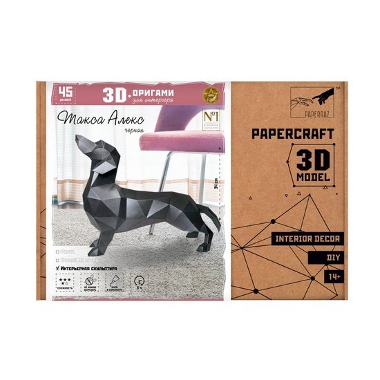 | Информация | 3D-конструктор PAPERRAZ для сборки полигональной модели «ТАКСА АЛЕКС» из дизайнерского картона. Готовая скульптура используется для интерьерного декора. Все детали вырезаны и пронумерованы, подготовлены линии сгиба. |