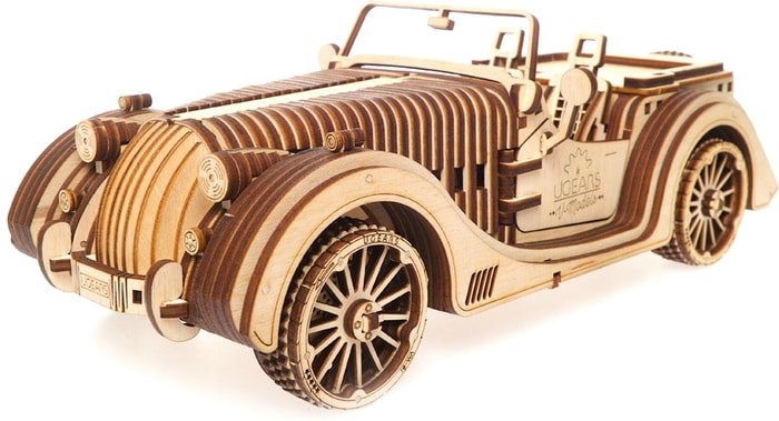 | Информация | Своей уникальной харизмой модель обязана как техническим характеристикам, так и максимально детализированному, реалистичному ретро-дизайну. Точность и плавность линий корпуса достигнута благодаря комбинации элементов из фанеры разной толщины – 4 и 2 мм. Откинув крышку капота, можно увидеть работу восьмицилиндрового двигателя, понаблюдать ход поршней.Автомобиль имеет коробку передач с тремя режимами: вперед, назад и холостой ход. Направление движения можно регулировать поворотом руля. Еще большей реалистичности модели придают амортизированные передние колеса.Мощный резиномотор позволяет машине проехать до четырех метров за один завод. Ключ завода резиномотора выполнен в виде запасного колеса в задней части Родстера. |
